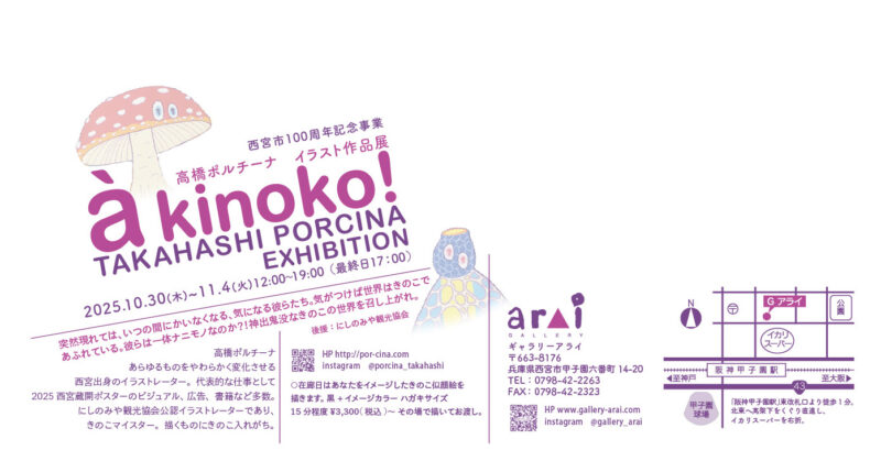 西宮市出身のイラストレーター・高橋ポルチーナさんによる作品展「à kinoko!」が、2025年10月30日(木)〜11月4日(火)の6日間開催!!