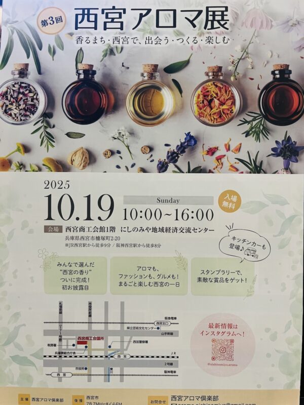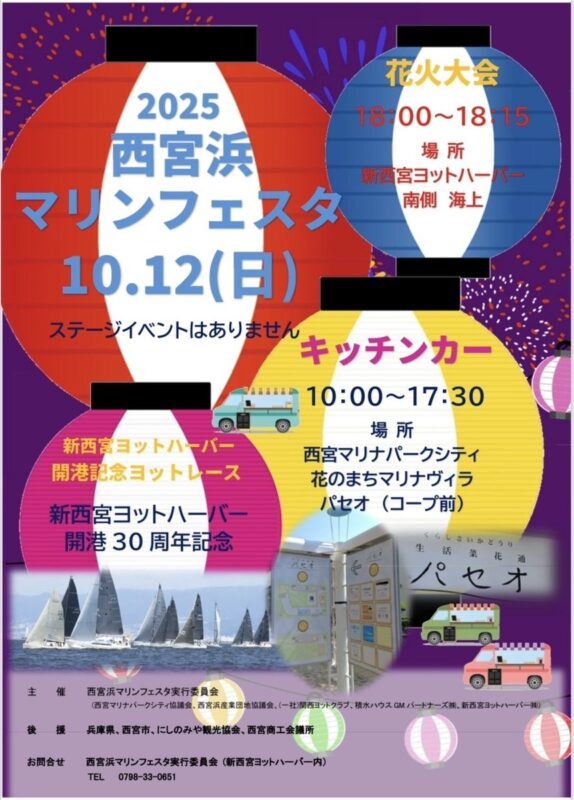 10月10日(金)招福縁日 十日市@西宮神社10月11日(土)西宮山口アルキナーレ202510月12日(日)「弥栄(いやさか)祭り」@御前浜公園10月12日(日)公智神社秋祭り本宮(だんじり巡行)10月12日:バンド甲子園グリスタチャレンジ@コロワ甲子園10月12日(日)マリンフェスタ@新西宮ヨットハーバー&西宮マリナパークシティ 花のまちマリナヴィラ パセオ10月12日(日)なるお昔語りの集い『鳴尾はスポーツのメッカだった?』10月12日(日)音盤と娯楽映画の昭和(西宮☆モダンタイムス)10月12日(日)オータムコンサートVol.3@西宮市プレラホール10月17日〜19日 関西フローティングボートショー@新西宮ヨットハーバー10月18日(土)映画とラジオと音楽と〜放送と歩んだ半世紀10月18日/19日 甲子園まつり@甲子園素戔嗚神社10月18日(日)船坂プチマルシェ@船坂里山学校10月19日(日)今回は「西宮市長杯」!!親子で一緒にミニ四駆を作って、ミニ四駆専用コースで走らせよう!@GR Garage 西宮 ダイハツ西宮建石10月19日(日)まちと、うみやまマーケット@甲山森林公園10月19日(日)西宮アロマ展@西宮商工会館1F10月19日(日)西宮キッズパフォーマーフェスタ@鳴尾・武庫川女子大前駅広場10月25日(土)西宮市民まつり@六湛寺公園10月25日(土)古本ガチャin にしのみや市民祭り@六湛寺公園10月25日(土)お仕事体験フェス・みやしる@西宮神社10月25日(土)音祝!雅楽奏者なりの節心|百年の節目に贈る千年の音色と遊び心@甲東ホール10月25日(土)桃色JAZZ楽団 LIVE 2025@西宮市フレンテホール10月25日(土)第5回 楽遊書展「美しく清らかな文字と個性が創り出す文字の作品展」(11月2日まで)- 10月26日(日)赤胴マルシェ@武庫川団地