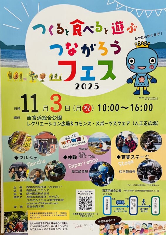 - 11月3日(月・祝)つくると食べると遊ぶ つながろうフェス@西宮浜総合公園レクリエーション広場