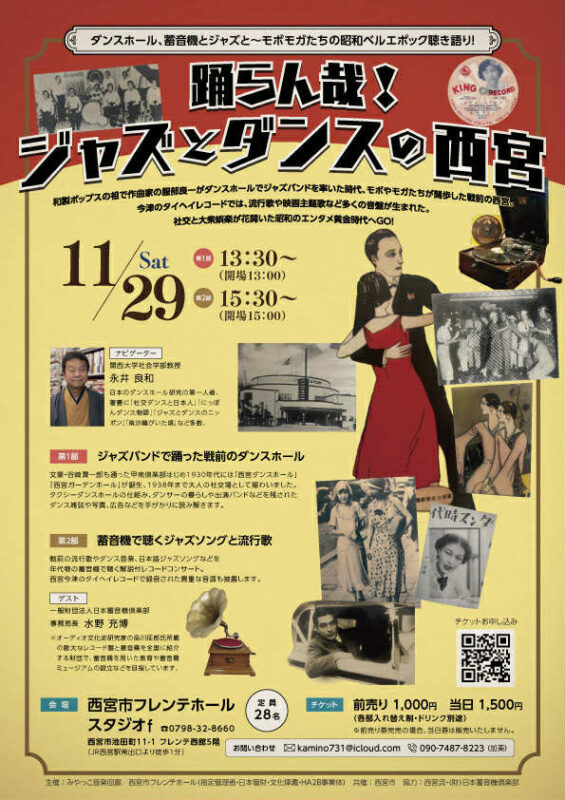 イベントの1部では、日本のダンスホール研究の第一人者でもある関西大学社会学部教授の永井良和氏をナビゲーターに、戦前1938年まで賑わった西宮のダンスホール、当時のダンサー達の暮らしやダンス音楽などモボモガ全盛時代が紹介されます。