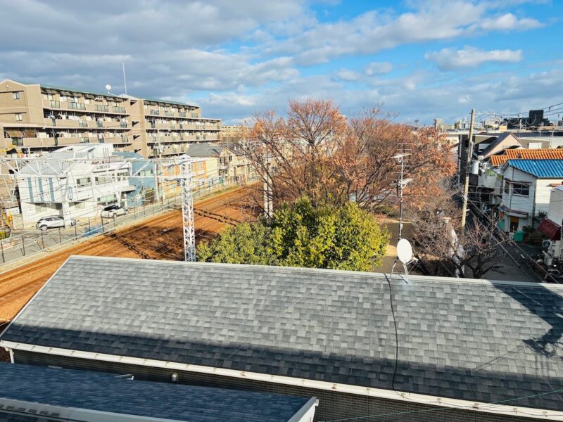 跨線橋から見た「甲子園口SL公園」(手前の屋根の向こうに見える大きな木々のあるところ)