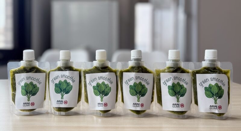 こうして新井組が育てた健康野菜の中から、小松菜を原材料にしたグリーンスムージーが完成した。