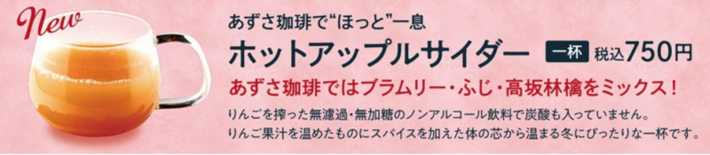 りんごを搾った無濾過・無加糖のノンアルコール飲料:りんご果汁を温めたものにスパイスを加えた、体の芯から温まる冬にぴったりな一杯!(限定販売)一杯 750円(税込)
