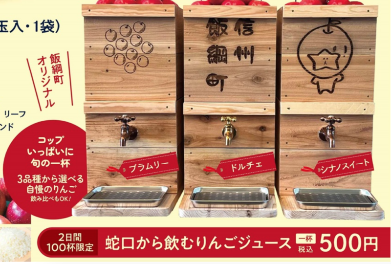 飯綱町オリジナル、蛇口から飲むりんごジュースが2日間限定でお楽しめる。