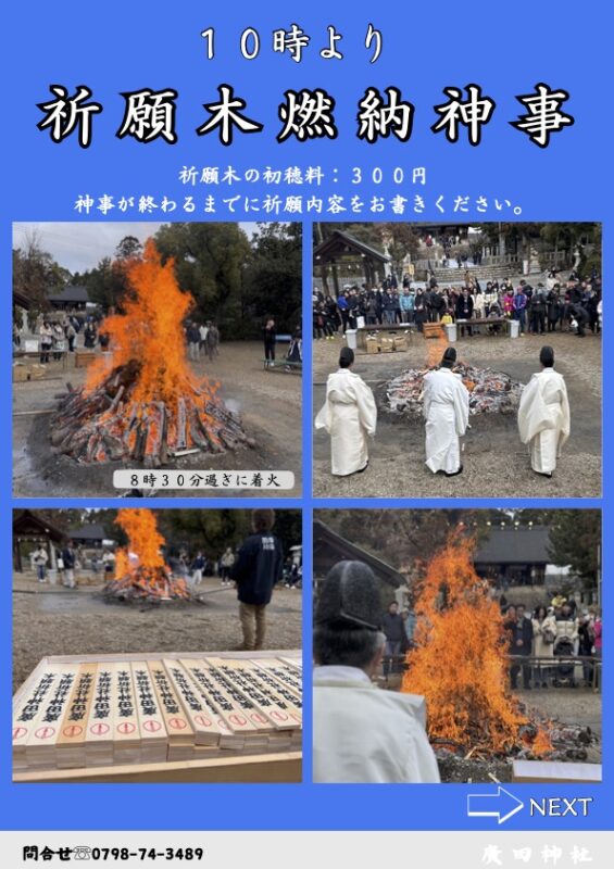 | 10時 | 祈願木燃納神事 | 広場 | 祈願木は当日でも書けます |