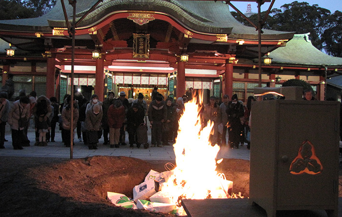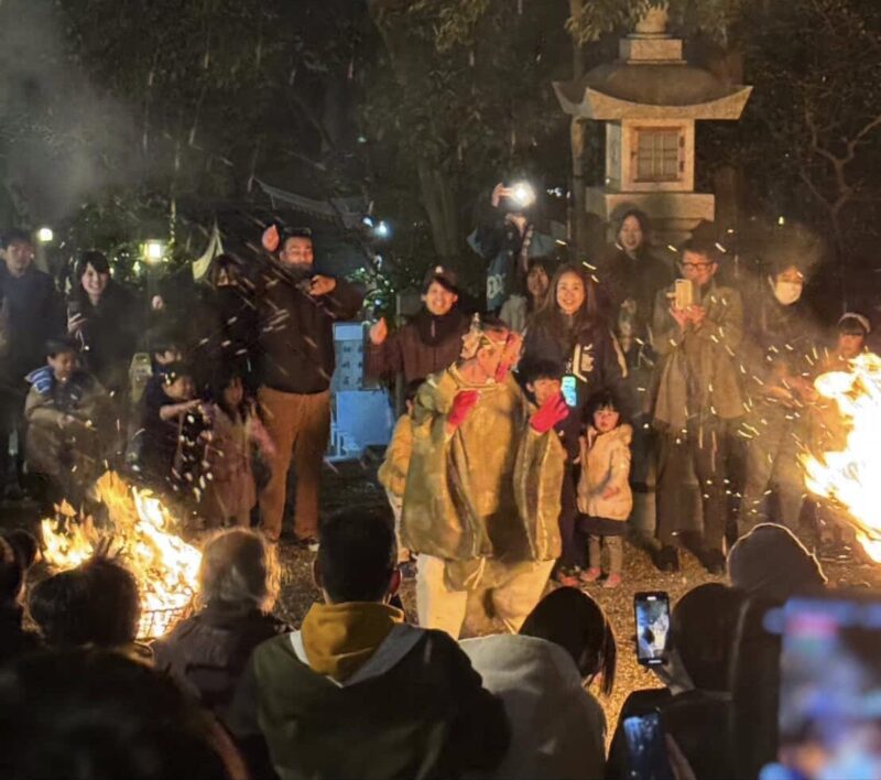 「節分祭・厄除祈願大祭」では、篝火が灯された境内に鬼がやってきます。