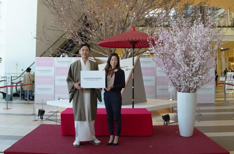 会場となったのは、西宮ガーデンズ本館メインエントランスに設けられた特設ステージ。そこには大きな桜の木が飾られ、ひと足早いお花見ムードに包まれていました。やわらかな春の空気が漂うなか、小泉さんは日本酒を片手に、桜やお花見にまつわるトークを繰り広げました。