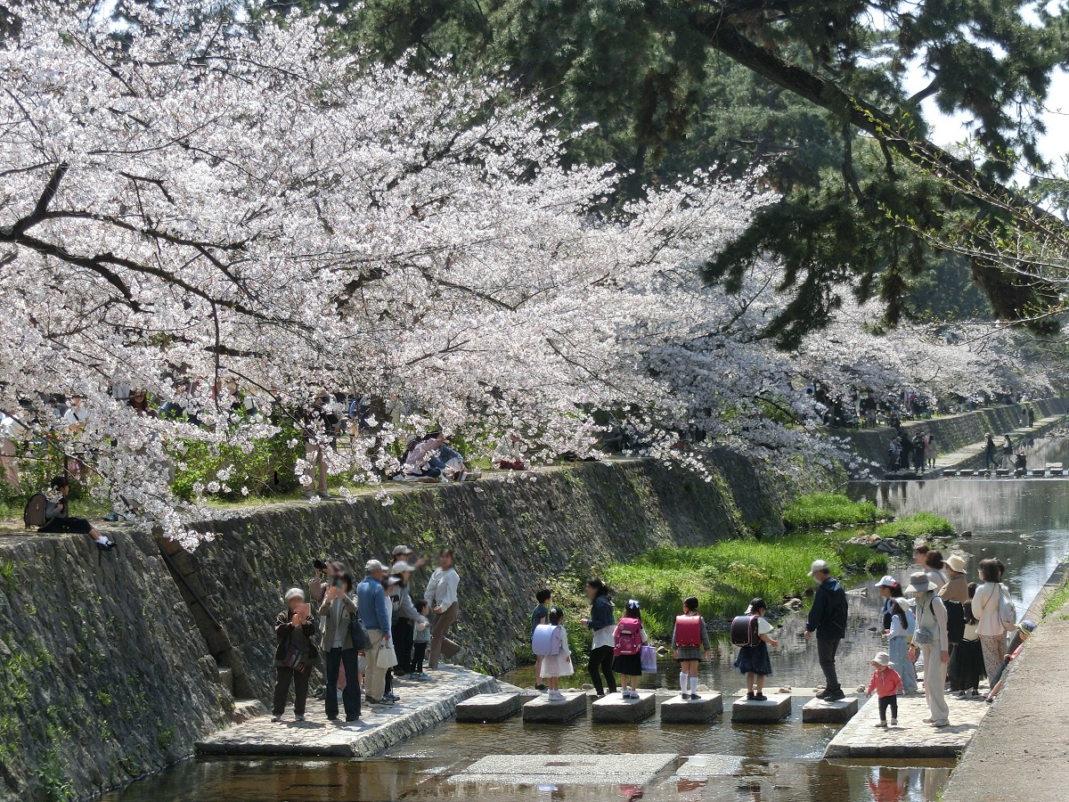 西宮の桜の名所「夙川公園」は、松の緑に約1600本の桜が美しく映えます。
