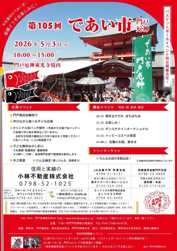 今年の連休もすでに始まっておられる方もありますが、あたらめて2026年5月2日〜6日の間に開かれる西宮市内のイベントをまとめました!!